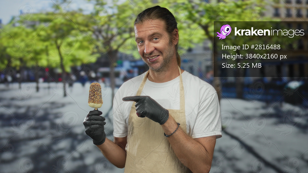 Man with blond hair wearing apron and black glove holds popsicle and points finger at building; delight.