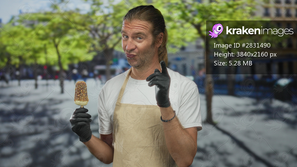 Man with blond hair wearing apron and black glove holds popsicle and points finger at building; delight.