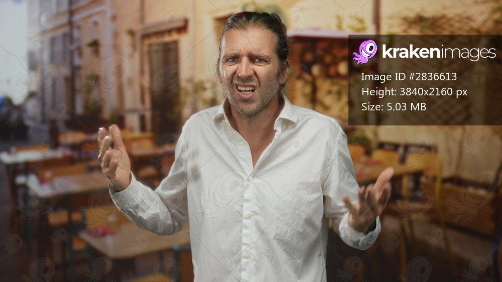 Man with blond long hair and white shirt raising palms in street outside cafe terrace under sunlight; frustration.