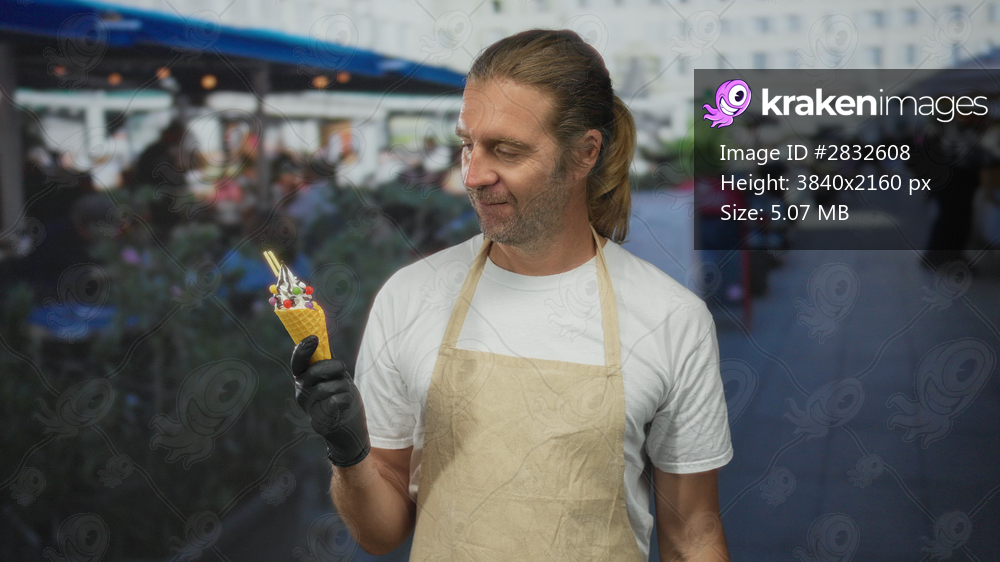 Man with blond ponytail wearing apron and black gloves holding ice cream cone in street market; satisfaction.