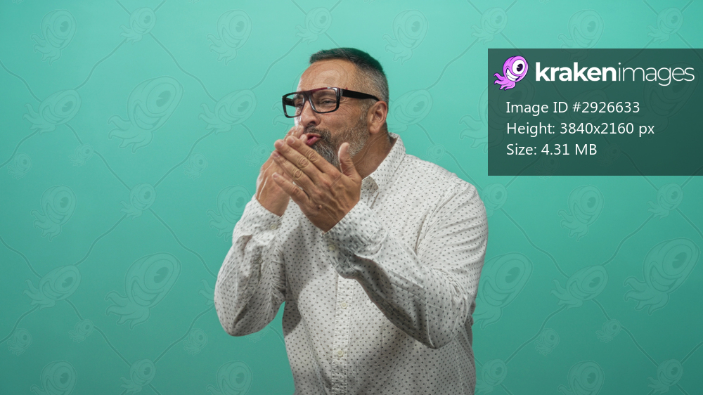Man blowing a kiss with both hands to camera in teal studio, wearing glasses and white dotted shirt; affection playful greeting.