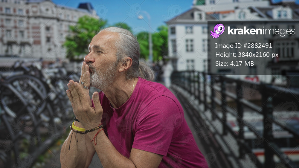 Man blowing a kiss with hands near mouth on bridge street in amsterdam; affection greeting sunlit urban.