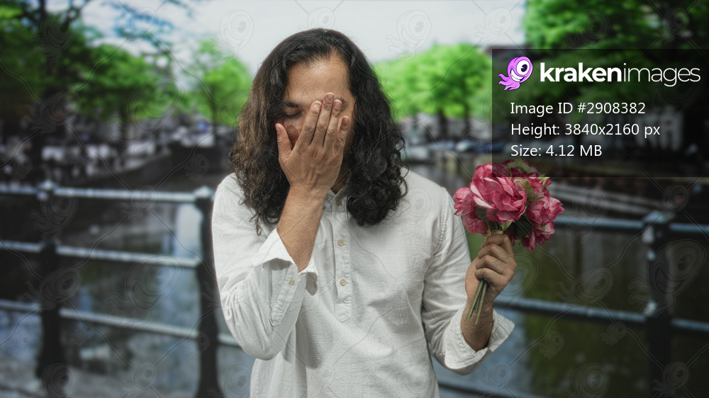 Man blowing a kiss and holding a bouquet on a street canal in amsterdam, smiling gently; romance playfulness.