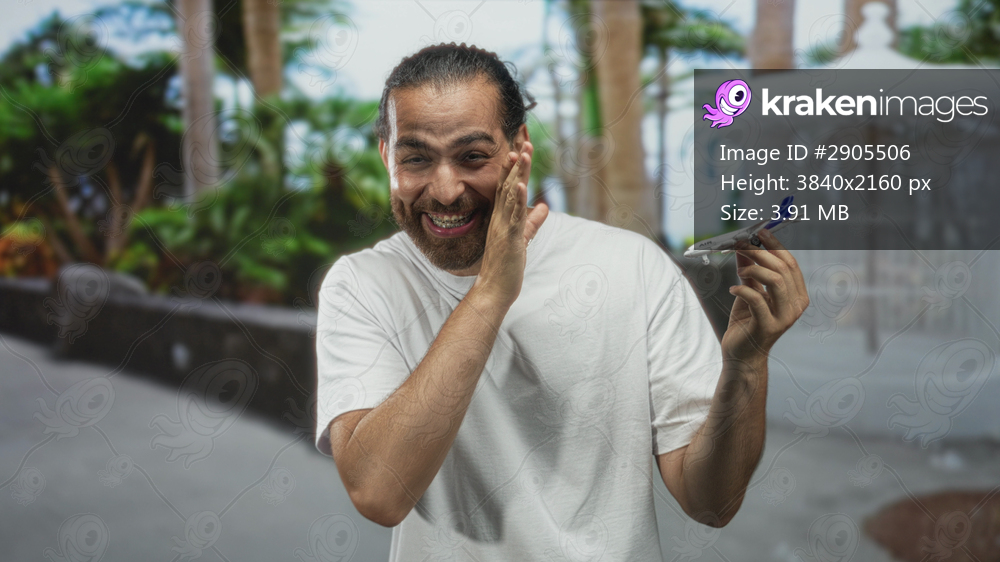 Man with braces holding toy airplane, hand on cheek for toothache in street; joy wanderlust travel escape.