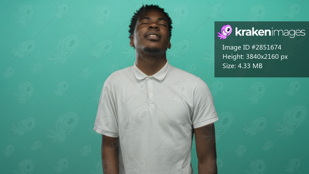 Man breathing with closed eyes and head tilted back against teal studio wall in meditative stance; serenity.