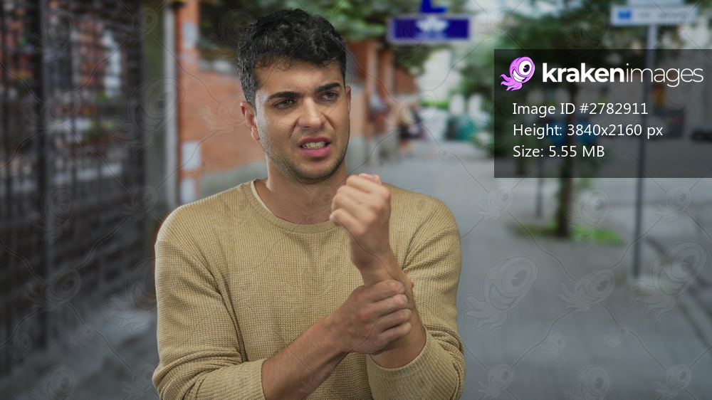Man with bruised wrist holds his arm on a busy street while young hispanic guy in outdoor setting suffers pain from wrist injury.