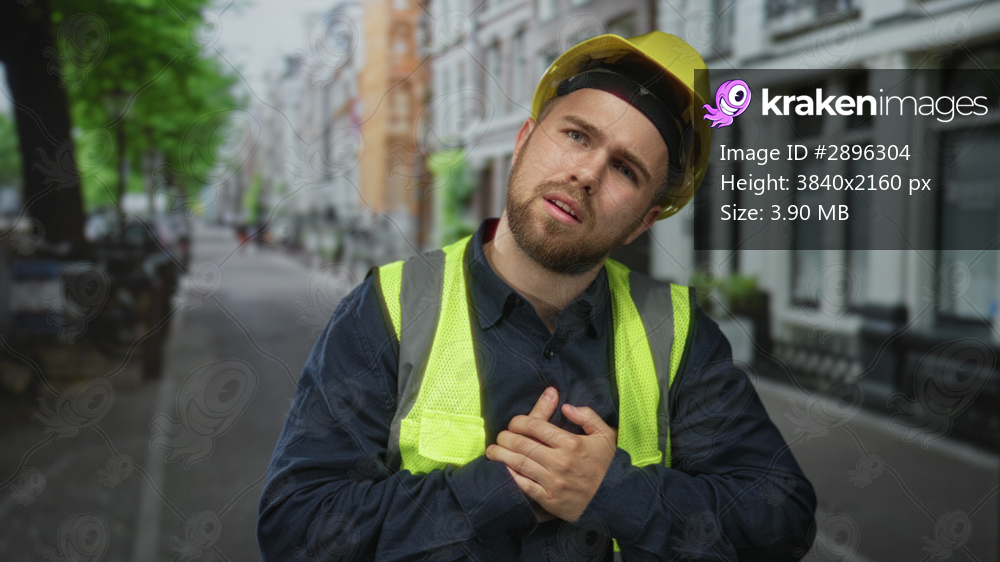 Man builder clutching hands to chest on city street wearing yellow hardhat and neon safety vest; medical emergency distress.