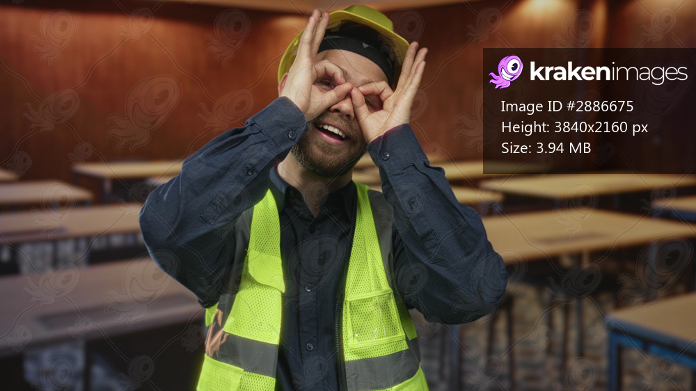 Man builder in a building wearing yellow hardhat and high visibility vest makes hand binoculars with fingers to eyes; safety training curiosity.