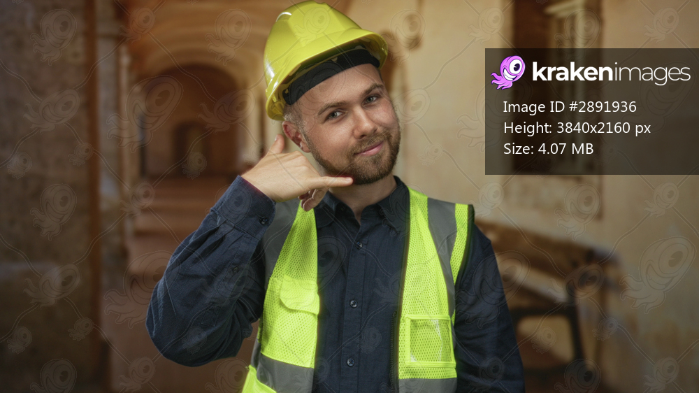 Man builder in hardhat and high visibility vest points finger at camera in old town building corridor; confidence safety.
