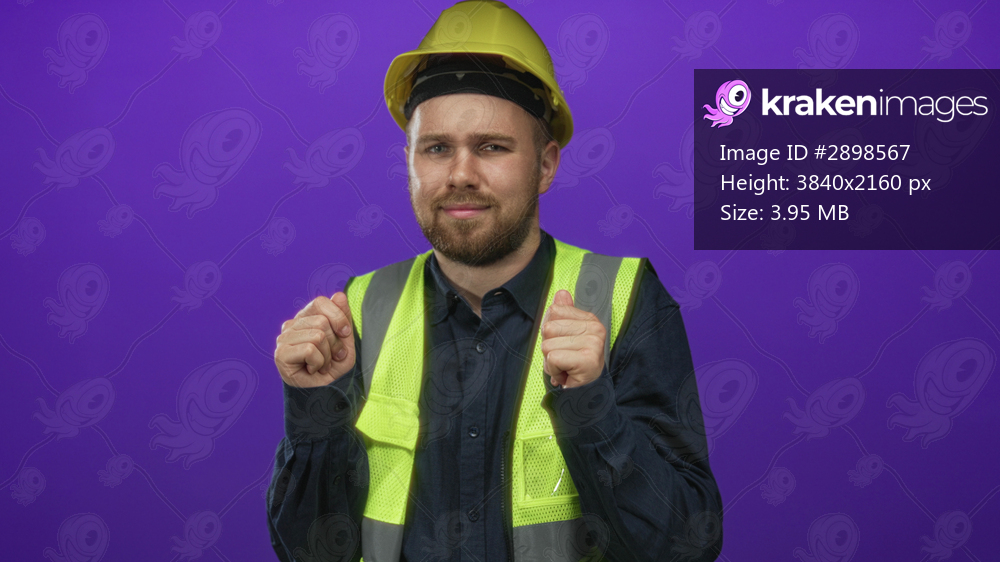 Man builder in yellow hardhat and hi vis vest with hands raised in purple studio; frustration safety concern.