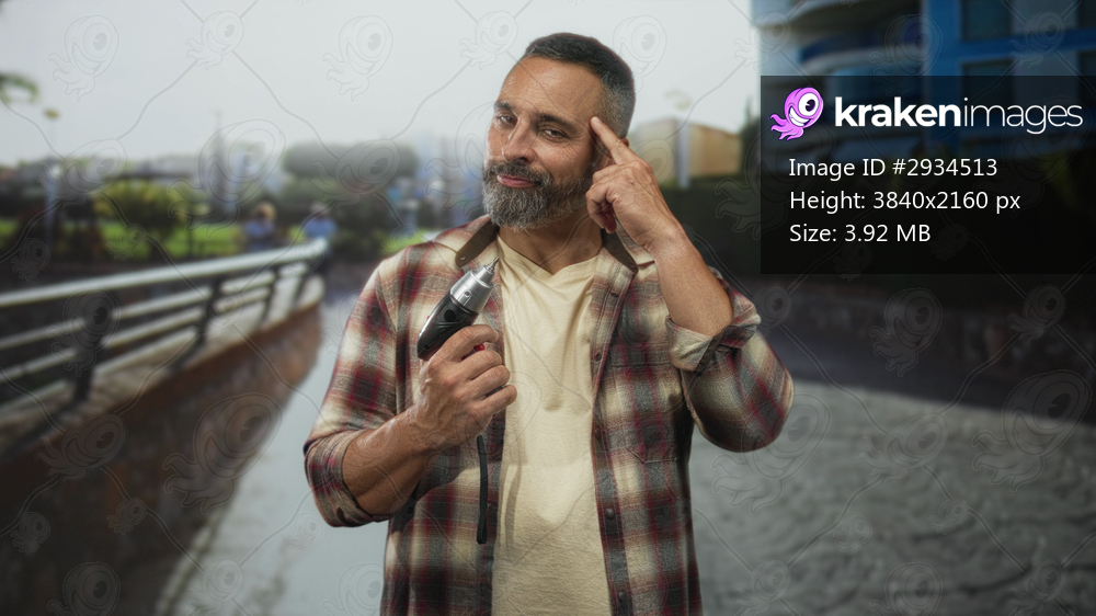 Man carpenter holding electric drill while finger pointing to head on street near railing and building, middle age with grey hair and beard; confidence skill. - Kraken Images
