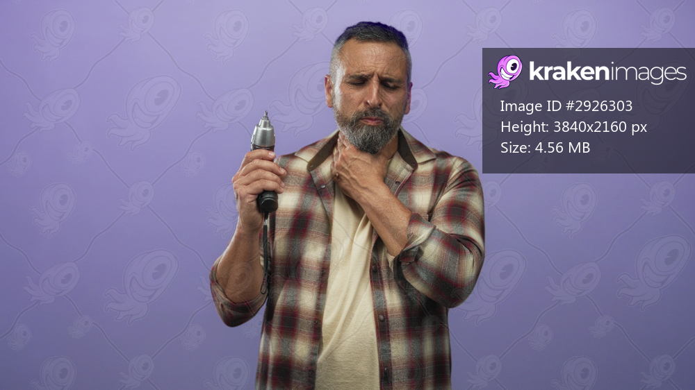 Man carpenter middle aged with beard holding power drill and clutching neck with pained expression in studio; discomfort safety concern.