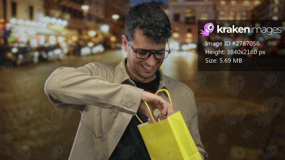 Man carries a gift bag before reaching toward merchandise near street vendor as male shopper, guy with young look, hispanic charm amid city bustle at night. - Kraken Images