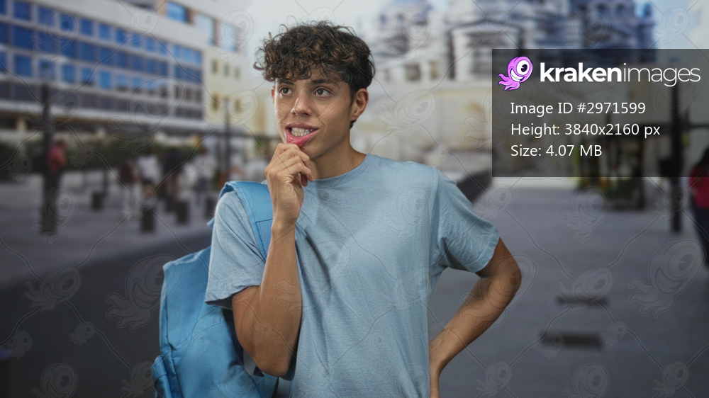 Man carrying blue backpack with finger to lips and hand on hip, chewing gum in casual teenage pose on city street; curious thought.