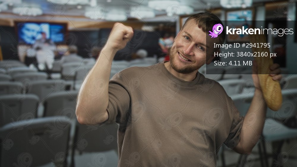 Man caucasian young heavyset holding a baguette and raising fist in building art gallery with rows of chairs and framed paintings, smiling; joy humor.