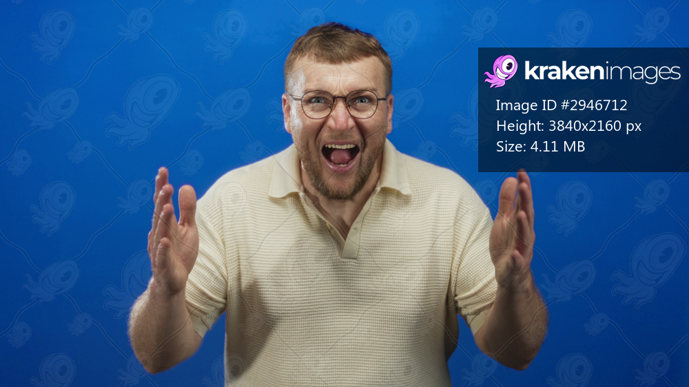Man, caucasian young with raised hands shouting and grimacing, wearing glasses and beige polo in blue studio; frustration stress tension.