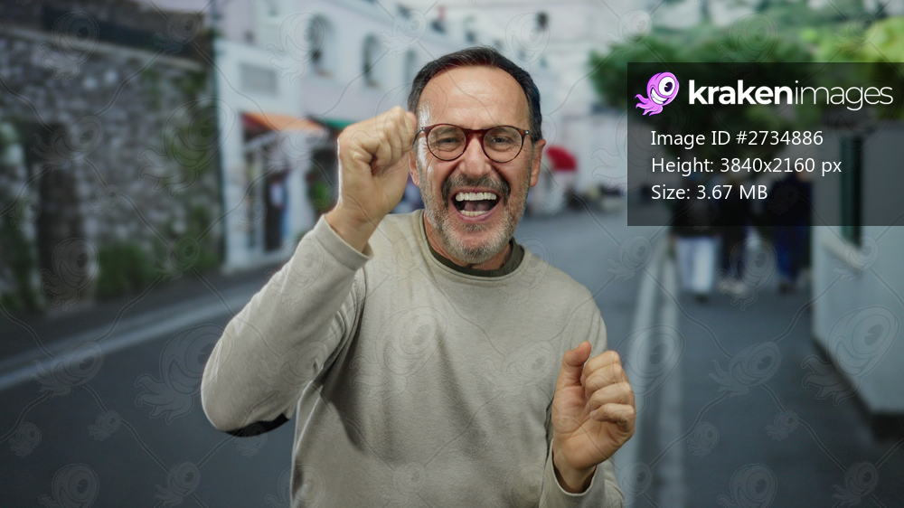 Man celebrating in vibrant city street with urban backdrop expressing joy and excitement showcasing lively outdoor atmosphere.