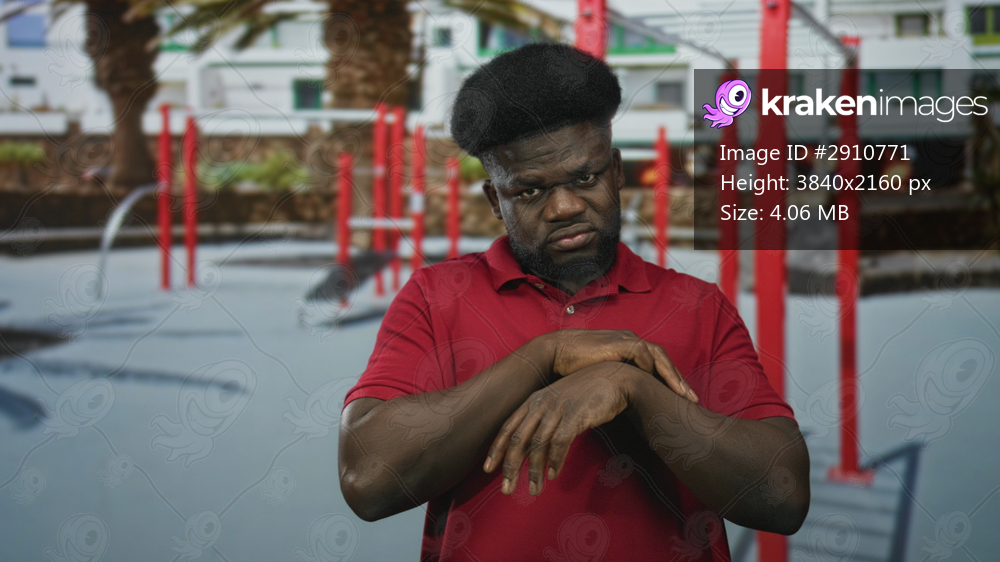 Man checking his palms with clasped hands by outdoor gym street bars in red polo; concern recovery focus.