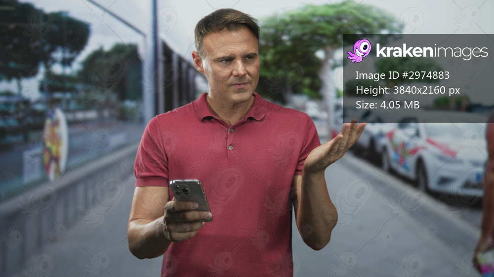Man checking smartphone with palm up shrug on street near parked cars and glass storefront reflection; frustration uncertainty isolation.