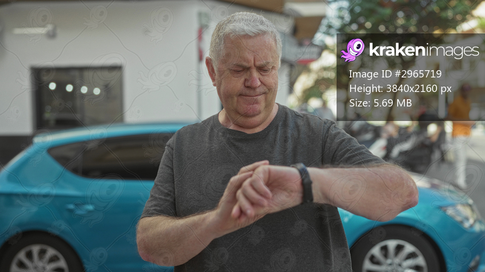 Man checking wristwatch while standing on a busy urban street beside a blue car and parked scooters; waiting impatience.