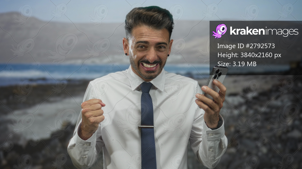 Man checks smartphone screen at beach in white shirt and navy tie while smiling; serenity calm connection.