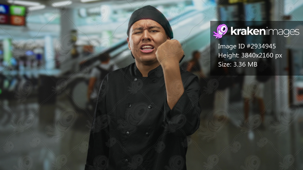 Man chef with clenched fist and grimace in busy airport terminal near checkin kiosks; kitchen frustration.