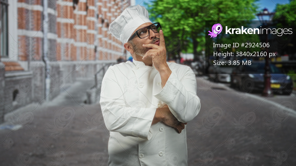 Man chef with finger to lips and crossed arms on street wearing white uniform and chef hat; thoughtful silence.