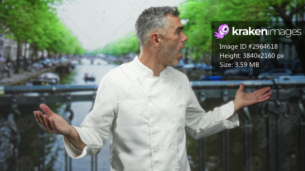 Man chef with grey hair in white jacket gestures with open hands on a street bridge over a canal; uncertainty surprise.