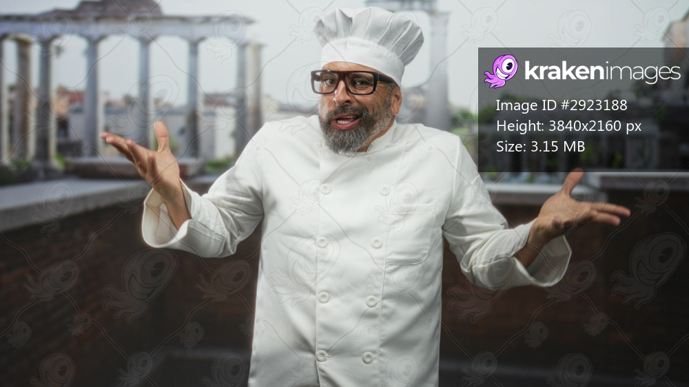 Man chef with hands raised gesturing on building rooftop terrace while shrugging in uniform and hat; confusion culinary humor.