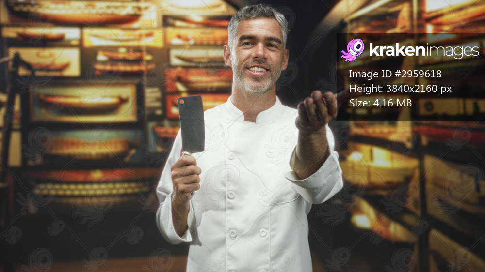 Man chef holding a cleaver and presenting with eyes closed in a building exhibit of boats and maritime models; serenity focus.