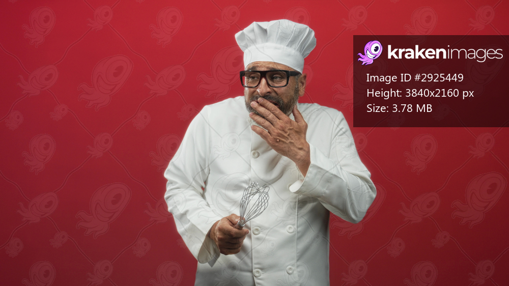 Man chef holding a metal whisk and hand to mouth in a studio with red backdrop wearing white chef uniform and toque; nervousness.
