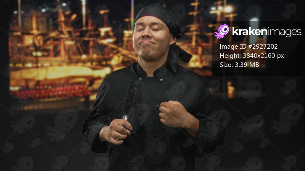Man chef holding knife and clenching fist to chest in museum ship exhibit indoors while wearing black chef uniform and bandana; pride tradition.