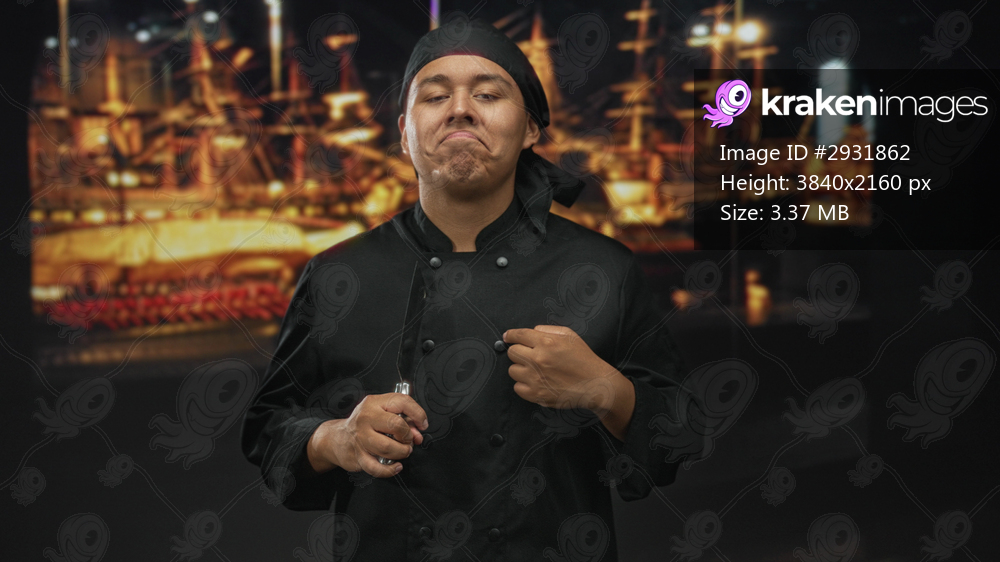 Man chef holding knife and clenching fist to chest in museum ship exhibit indoors while wearing black chef uniform and bandana; pride tradition.