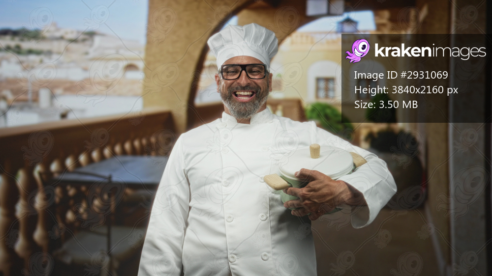 Man chef holding lidded pot on building balcony terrace, wearing white uniform and chef hat, hands and forearm visible near railing; pride craft.