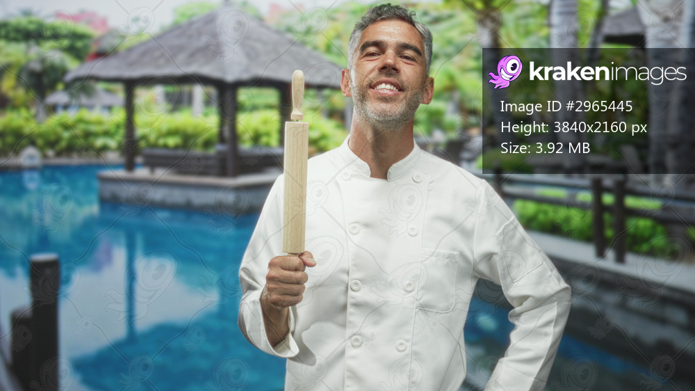 Man chef holds rolling pin upright and hand on hip, smiles with closed eyes beside resort pool in building; contentment.