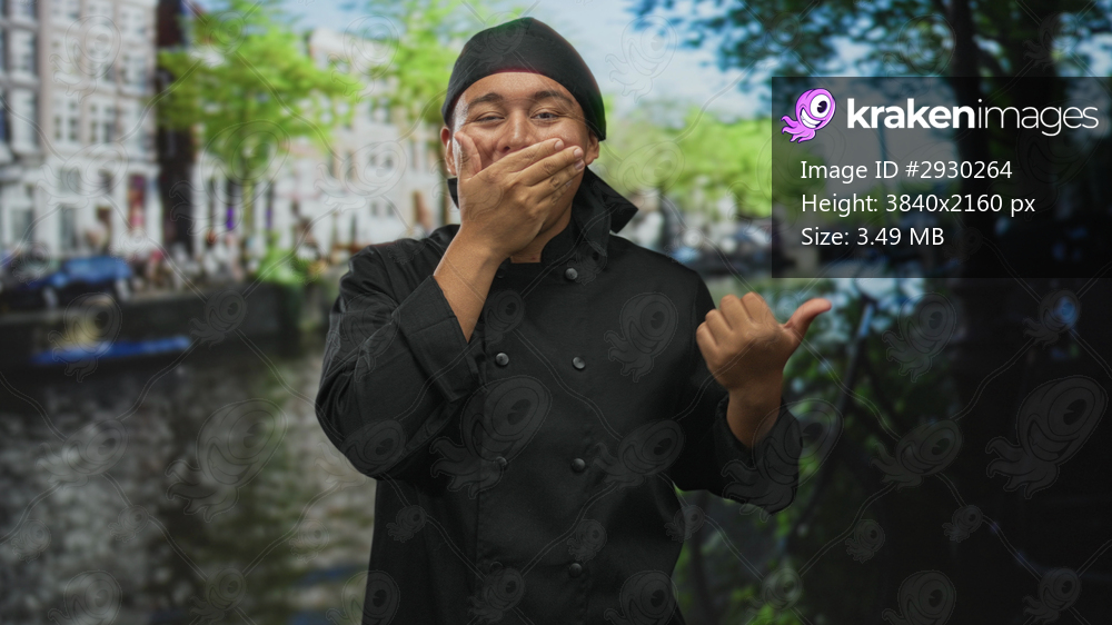 Man chef in black uniform with hand over mouth pointing thumb to street canal in amsterdam near water; surprise invitation.