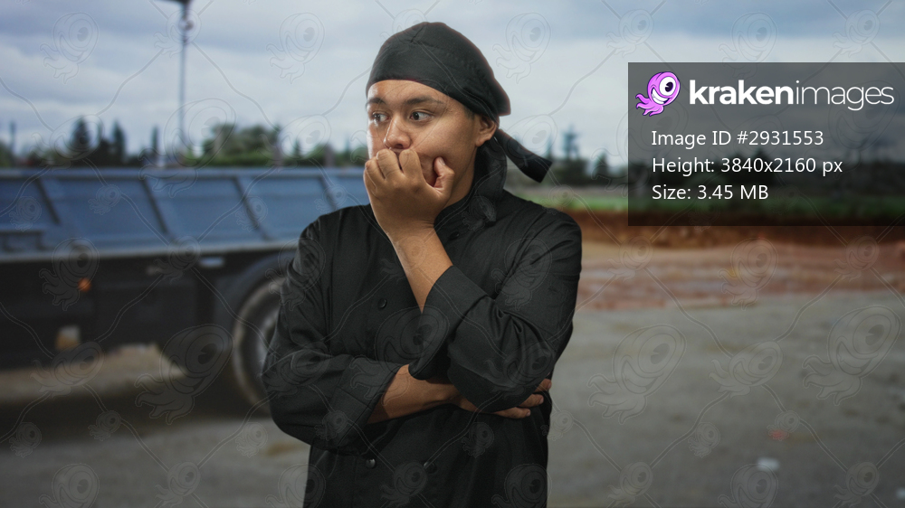 Man chef in black uniform with hand to mouth and crossed arms on street; anxiety worry concern stress.