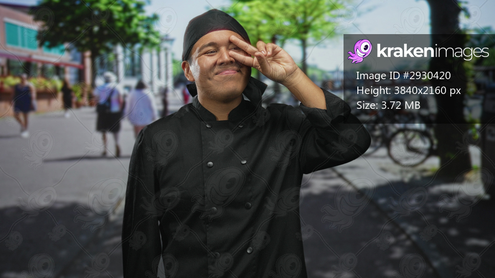Man chef in black uniform and headscarf making peace sign to eye on busy city street lined with bicycles and blurred pedestrians; playful confidence.