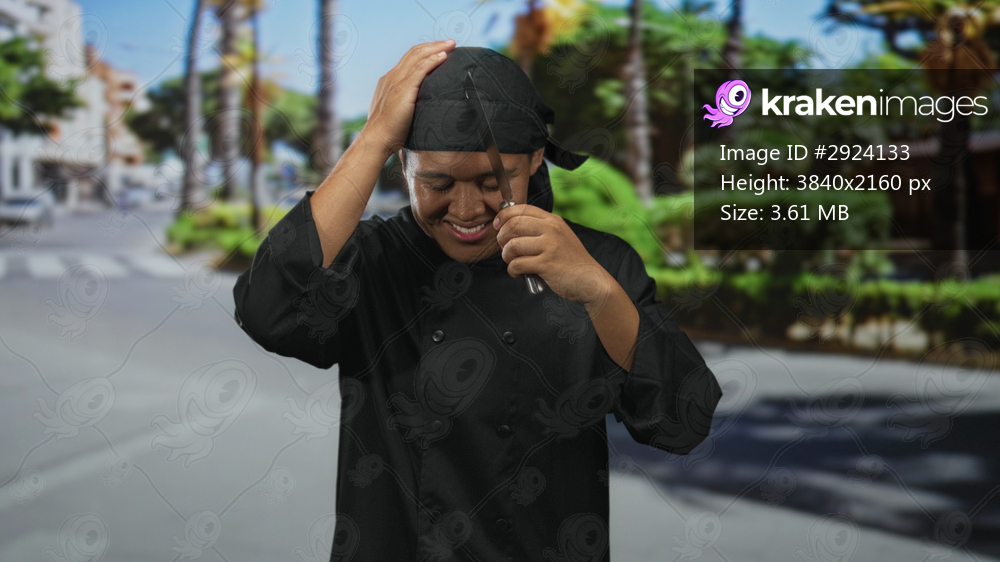 Man chef in black uniform holding knife to head on street, hand on head and smiling with eyes closed in an outdoor city crosswalk scene; playful joy.