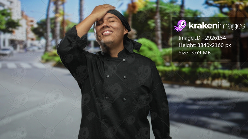 Man chef in black uniform holding knife to head on street, hand on head and smiling with eyes closed in an outdoor city crosswalk scene; playful joy.