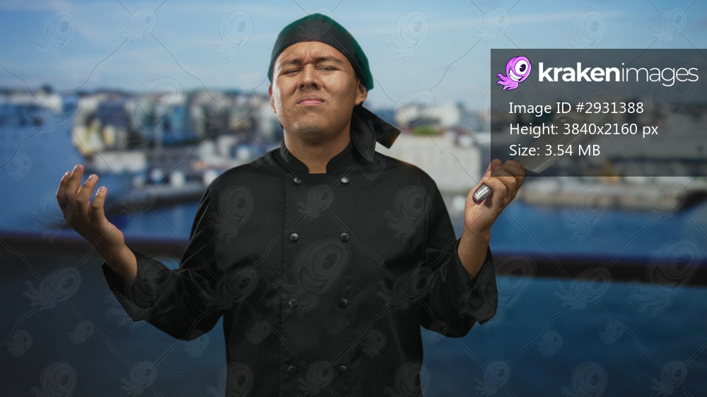 Man chef in black uniform holds cleaver near head with closed eyes on seaside building terrace while gesturing with free hand; frustration kitchen stress. - Kraken Images