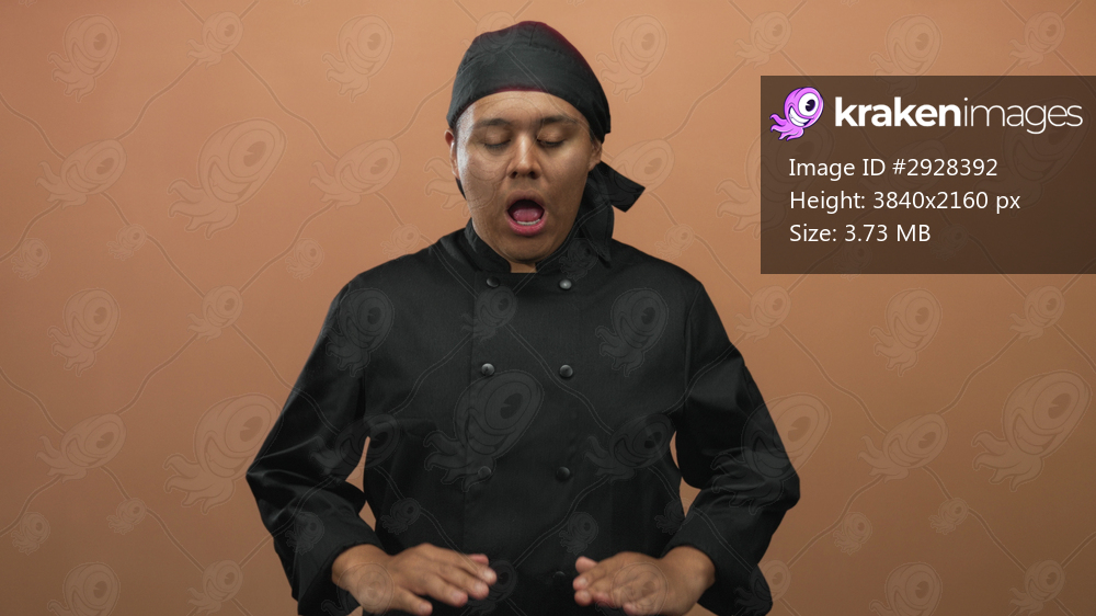 Man chef in black uniform making chef kiss with hands and puckered mouth in studio with peach background; satisfaction.