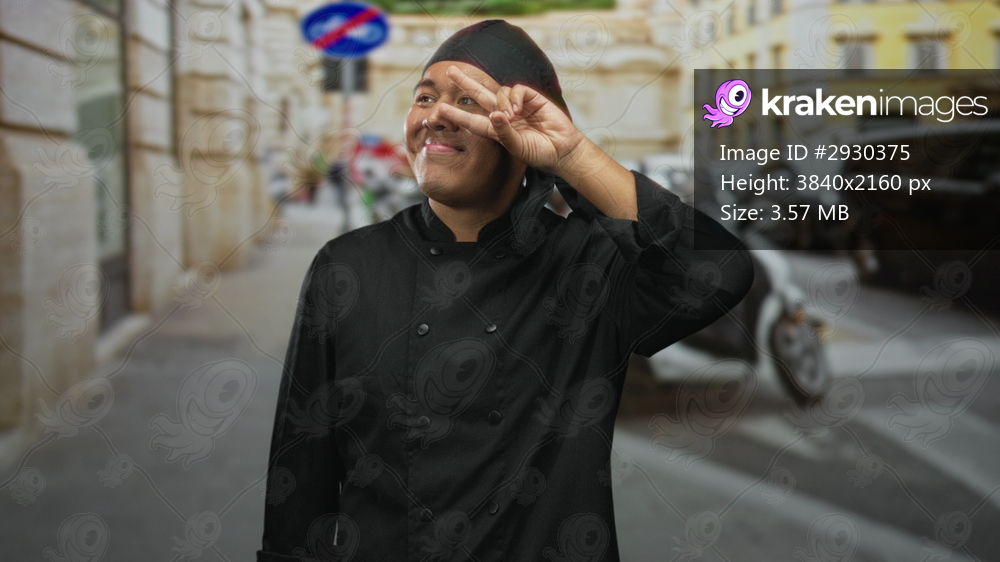 Man chef in black uniform making peace sign to eye on street in city with scooter and parked cars nearby; playful pride.