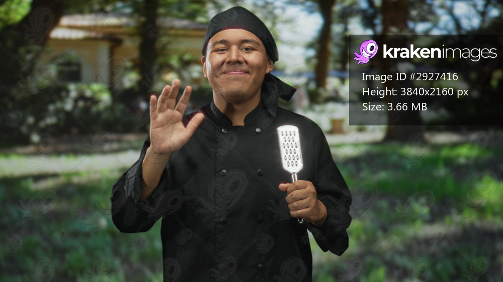 Man chef in black uniform waving hand and holding metal grater in forest; warm hospitality contentment.