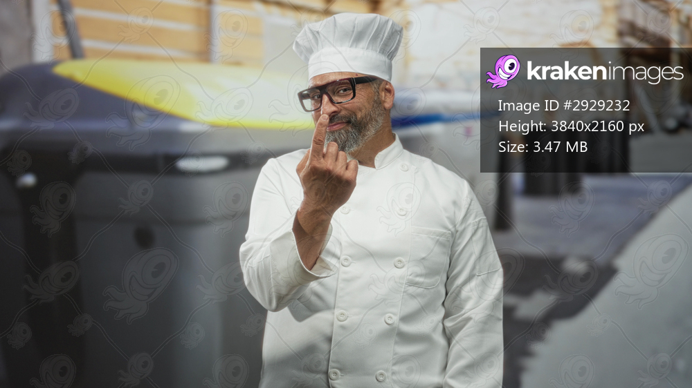Man chef in uniform pinching fingers near mouth beside recycling container on city street; pride craft skill.