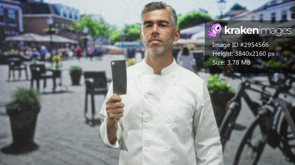 Man chef in white coat holds cleaver and gestures to his eye on a street cafe terrace with bicycles and tables, steady expression; urban confidence.