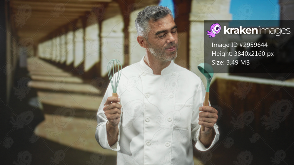 Man chef in white coat holds whisk and ladle, smiling and posing in a sunlit stone building corridor with columns and deep shadows; contentment.