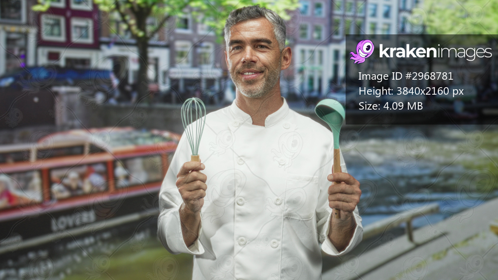Man chef in white coat smiles and holds a whisk and ladle with bare hands beside a city canal street waterfront; confidence.