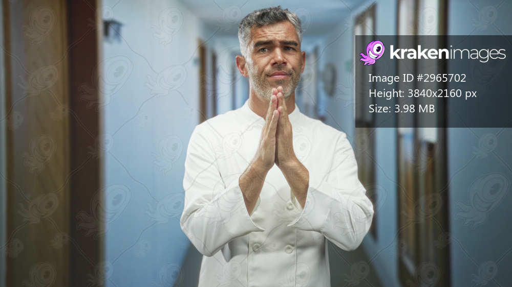 Man chef in white jacket stands in a hallway with hands pressed together in a praying gesture, beard visible; serenity reflection.