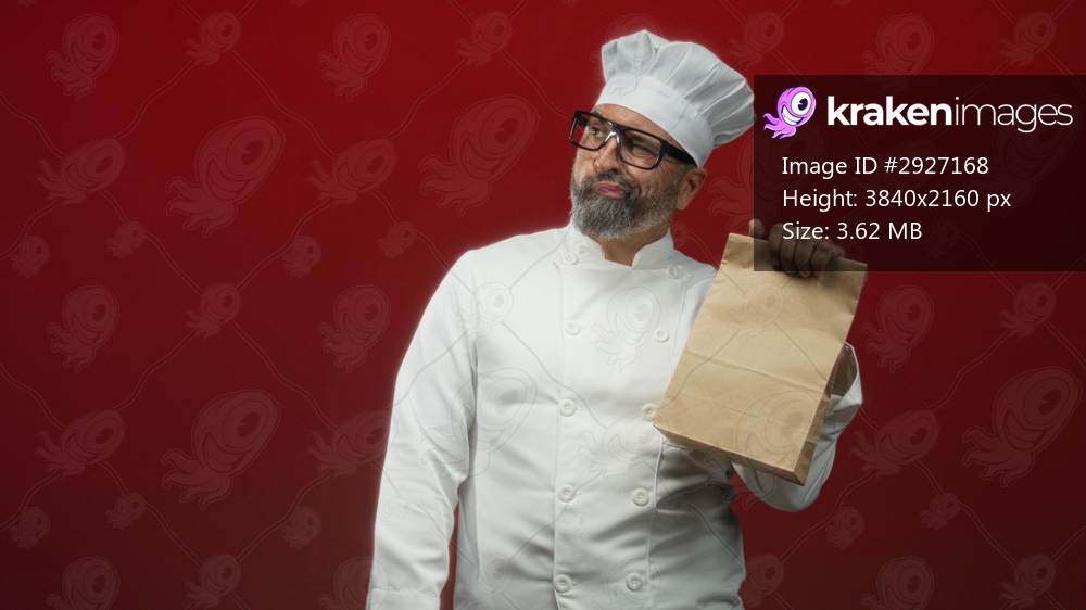 Man chef in white uniform and hat holds a brown paper bag and puckers lips in red studio; playful curiosity.